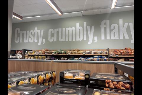 Next in line are the sushi area and a new delicatessen counter, which offers a personalised grazing box service. The row of counters which has the feel of a posh ‘Market Street’ is rounded off by an expanded in-store bakery featuring an exclusive new partnership with premium brand Ole & Steen, which will be rolled out to 35 stores. The bakery itself is decorated with the words ‘crusty, crumbly, flaky’ writ large on the wall behind the bakers. There is also a handy ‘Now baking’ sign that is illuminated while the key baking runs are in progress.