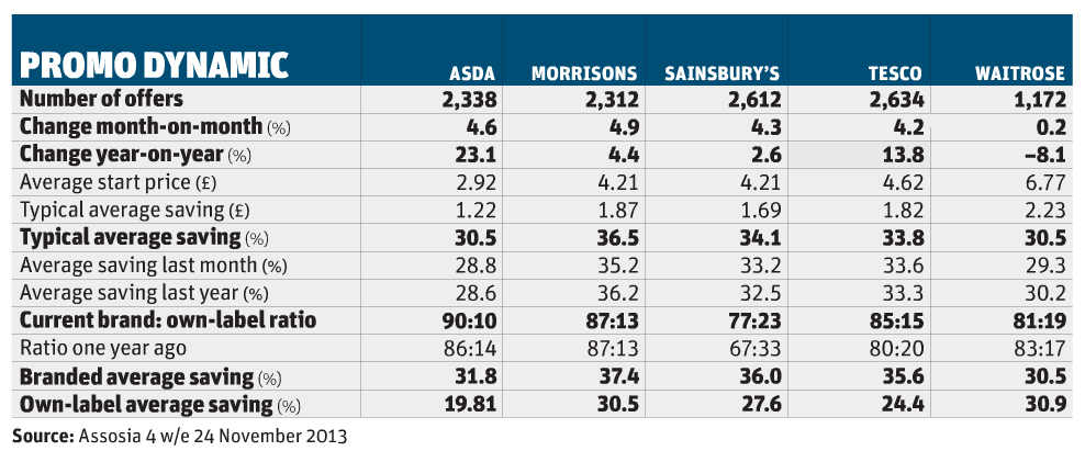Meanwhile Asda, which last month revealed plans to invest £1bn cutting prices over the next five years in order to grow the gap over its big four rivals and close it on the discounters, has also caught the promotional bug. For the four weeks to 24 November it had 2,338 deals, up 4.61% month on month and a massive 23.12% on the same period last year. Its average savings was also 6.55% higher than in 2012 – the biggest increase of any of the leading retailers.